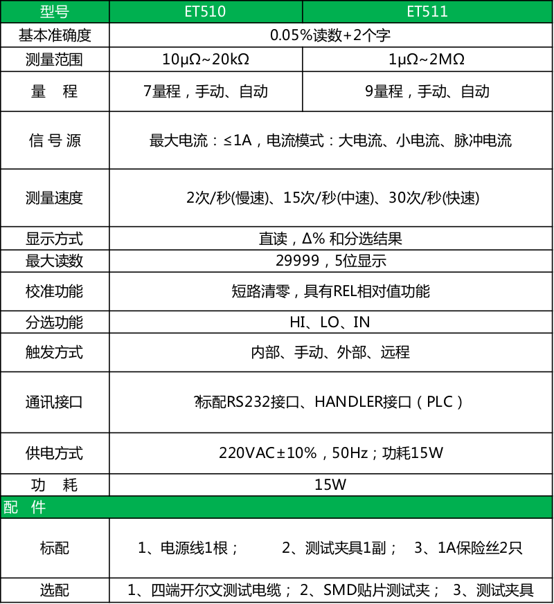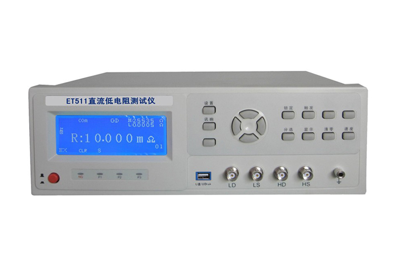 ET510、ET511直流低电阻测试仪可用于线圈、电感、变压器、音圈、中低值电阻器、继电器接触电阻、接插件电阻、绕线电阻、线缆电阻、印制板线电阻、焊点接触电阻、电机线圈内阻、保险丝、锰铜分流器、电表分流器、导电膜、金属探伤等。是一种高速度、高精度、高性能的低电阻测试仪,可满足生产线质量保证、进货检验及实验室测量要求,也适用于自动化设备测试。